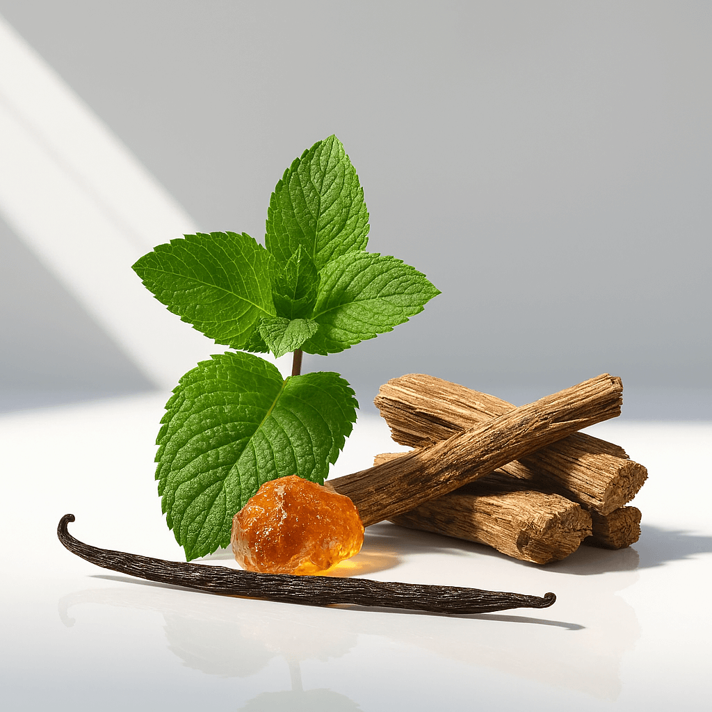 • En Fond : Le sillage s'installe avec une promesse de chaleur et de désir. Le Bois de Santal, le Musc, le Patchouli, la Vanille et l'Héliotrope s'entremêlent pour créer un fond riche et enveloppant qui laisse une impression inoubliable.